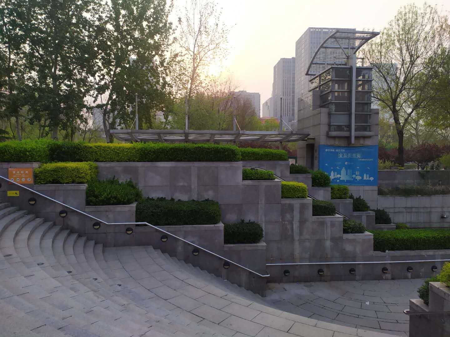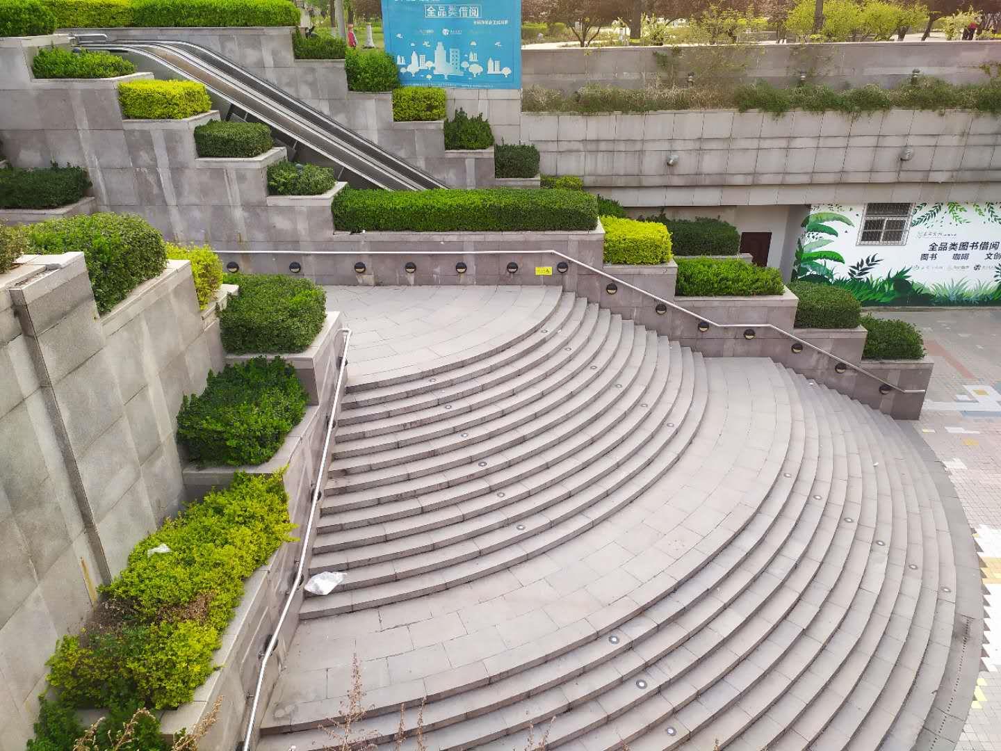 此处是地下书城的入口处,下面可以买书、就餐等,可惜在疫情期间都没有开门,也没有人,不过这下沉式的花台配上植物,层层叠叠,值得一观,