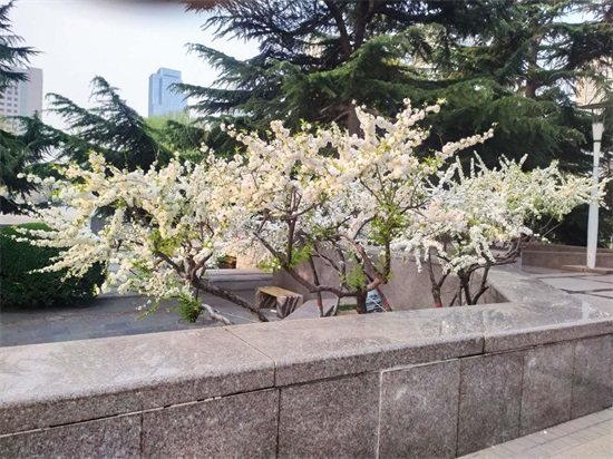 广场东侧有一小山坡,坡上步石旁边有几株樱花开得正浓,许多花朵拥簇在一起,粉红粉红的花朵挂满了枝头,很是壮观。