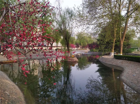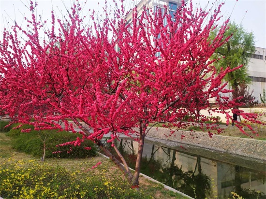 河道边的红叶碧桃开得如火如荼 ,充分展现了明媚的春光。