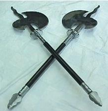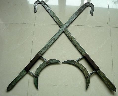 6.钺:又称为子午钺,钺分子午,一雄一雌,演练时开合交织,不即不离,酷似鸳鸯,故名“子午鸳鸯钺。