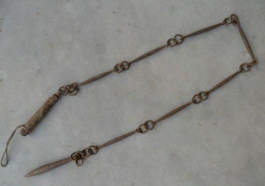 9.鞭:鞭有软硬之分,硬鞭多为铜制或铁制,软鞭多为皮革编制而成,常见的有七节鞭、九节鞭、十三节鞭等。