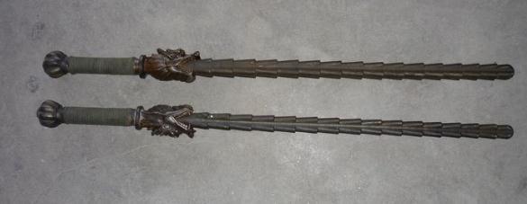 13.镋:有凤翅镋、雁翅镋、牛头镋、溜金镋、锯齿镋和流星镋等几种,镋不可以舞花,主要是左右手捻转使用。