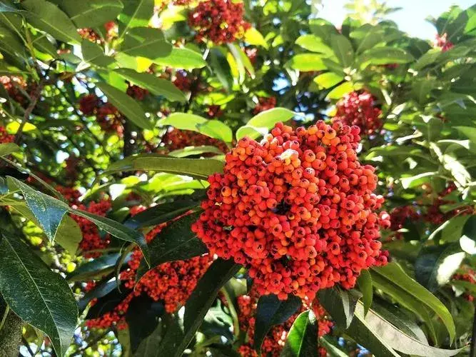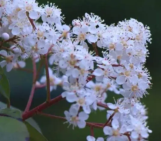 每当初春的时候,石楠花的新叶开始由紫红色慢慢变成绿色,到秋季的时候,它结出的果实像是挂在树上的,一串串紫红色的葡萄,远远望去,煞是好看。