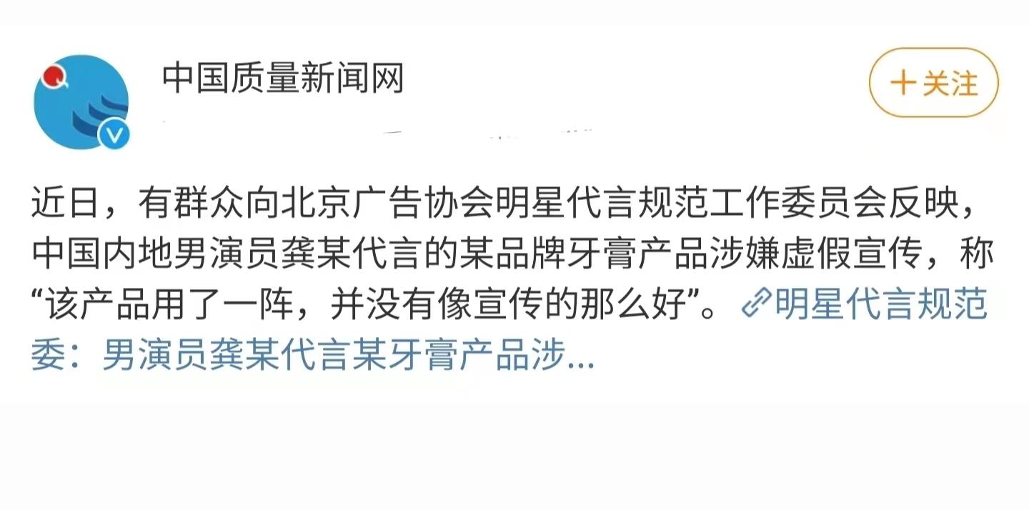 在文章中,“中国质量新闻网”提到了自己的记者从“北京广告协会明星代言规范工作委员会”获得了一些“投诉”,一些群众反映男演员龚某代言的某品牌牙膏涉嫌虚假宣传,因为消费者用了这个产品一阵后,觉得效果并没有想象中的那么好。