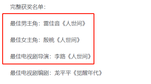 最终,《人世间》独揽4奖成为当晚最大赢家,雷佳音、殷桃拿下了“最佳男主角”和“最佳女主角”。