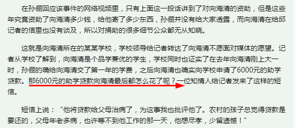 孙俪给向海清交了第一年的学费后,向海清又向学校申请了6000元的助学贷款。
