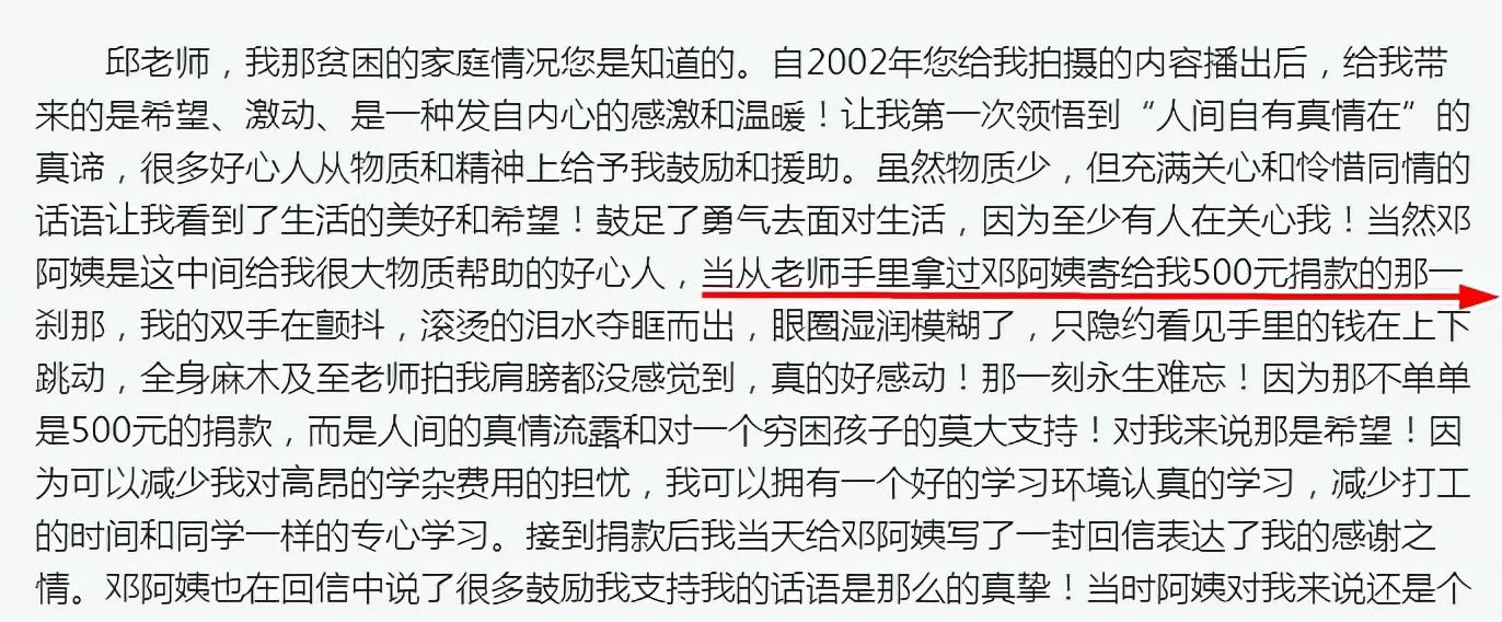 用后来向海清的话说,这些钱是“人间真情的流露和对一个贫困孩子莫大的支持,是希望。”