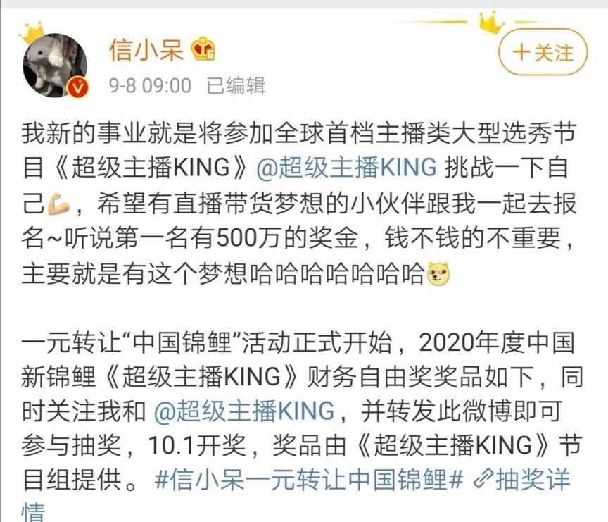 2020年9月7日,信小呆发布了一条“1元转让中国锦鲤”的微博。