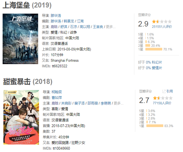 打开鹿晗的作品栏,可以发现他的作品寥寥无几,近几年没有作品不说,那些稍微拿得出手的也都是评分极低的“烂片”。