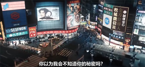 此时镜头景别不断放大,从一个小小的屏幕,到街头一角,再到灯红酒绿的夜间都市,无数个大屏幕里,都在播放着这则犯罪预告片。