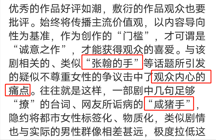 此剧一经播出,评分低到2.2不说,连人民日报都点名批评张翰的“咸猪手”行为和其中物化女性的低俗剧情!