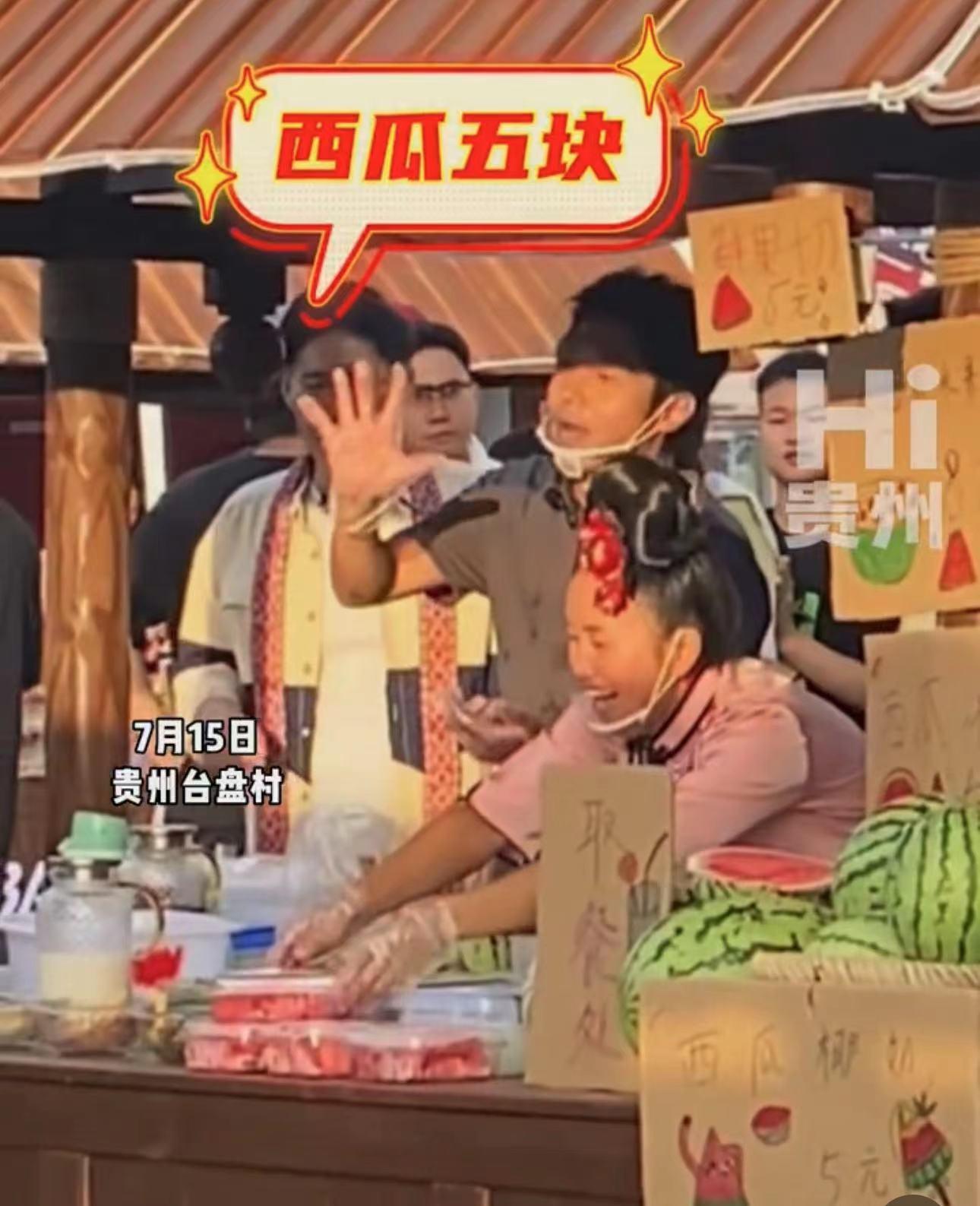 期间,有顾客问价时,他还竖起五个手指示意,随后帮顾客做了满满一碗西瓜甜水,动作看起来非常熟练,仿佛不是第一次摆摊卖西瓜。