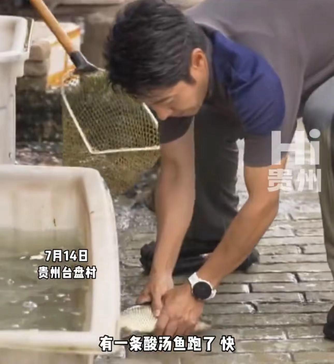 参加村BA前,撒贝宁先是游览了台盘村的集市。镜头中,他穿着一身灰色服装,打扮朴素。逛到某家鱼摊前,一条鱼正好跳到了地面上,撒贝宁连忙弯腰,一边手忙脚乱地抓鱼,一边感叹“有一条酸菜鱼跑了,快”。