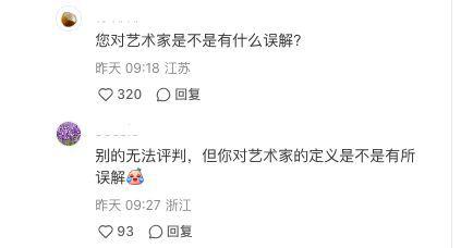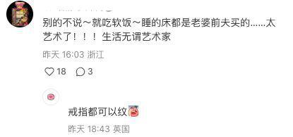 然而,随着这番赞美的传播,一些网友显然对此感到不满,纷纷发表各种吐槽的言论。有人调侃道:" 您对艺术家是不是有什么误解?"" 尊重艺术家就说人家的大名。人家又不是赘婿 "、" 别的不说,就吃软饭,睡的床都是老婆前夫买的太艺术了!生活无谓艺术家 "。