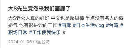 据一位网友透露:" 大 S 的老公人真的很好,中文说得超级棒,一点都没有名人的傲娇气质,而且他非常努力工作。" 此外,该网友还大赞具俊晔是艺术家。