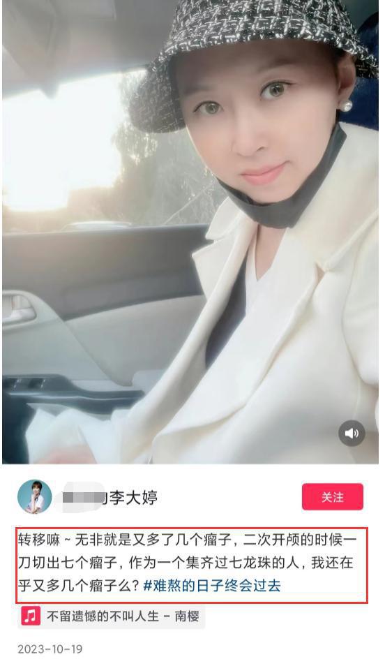 就在去年 10 月,得知癌症已经转移的李大婷还晒出美照安慰自己:无非就是又多几个瘤子,并透露自己二次开颅的时候一刀切出 7 个瘤子,自嘲自己集齐了七龙珠!