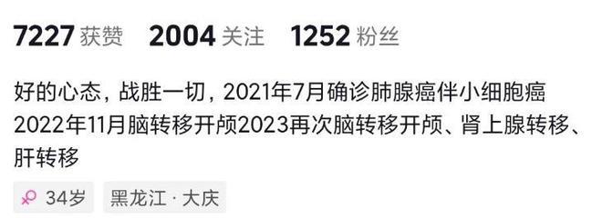 和其他抗癌网红一样,李大婷也是一位十分乐观的女子。她透露自己是 201 年 7 月确诊,2022 年 11 月和 2023 年两次开颅但仍多处转移。可即便如此,李大婷的 个人简介里还是写着:好的心态,战胜一切!