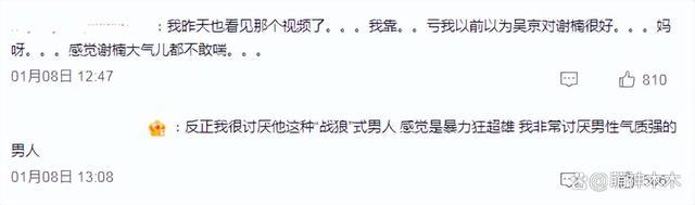 这样的场合不止一次,吴京谢楠曾经在节目中一起做饭,谢楠原本只是在一边给掌勺的吴京提出意见,但吴京对谢楠的插手很不耐烦,当着工作人员的面朝妻子发脾气,谢楠一直在顺从退让,最后一个人崩溃落泪,自言已经很努力去退让了。