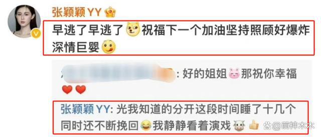 这样看来,张颖颖分手之后,对于汪小菲和张兰的怨念还是蛮深的,每次汪小菲感情有任何动向的时候,张颖颖就会立刻隔空 " 精准吐槽 ",之前汪小菲和美女约会被拍的时候,张颖颖跳出来回怼前男友,庆幸自己及时止损,称汪小菲是爆炸深情巨婴,一边挽留她,一边在分开的时间里和十几个人发生关系。