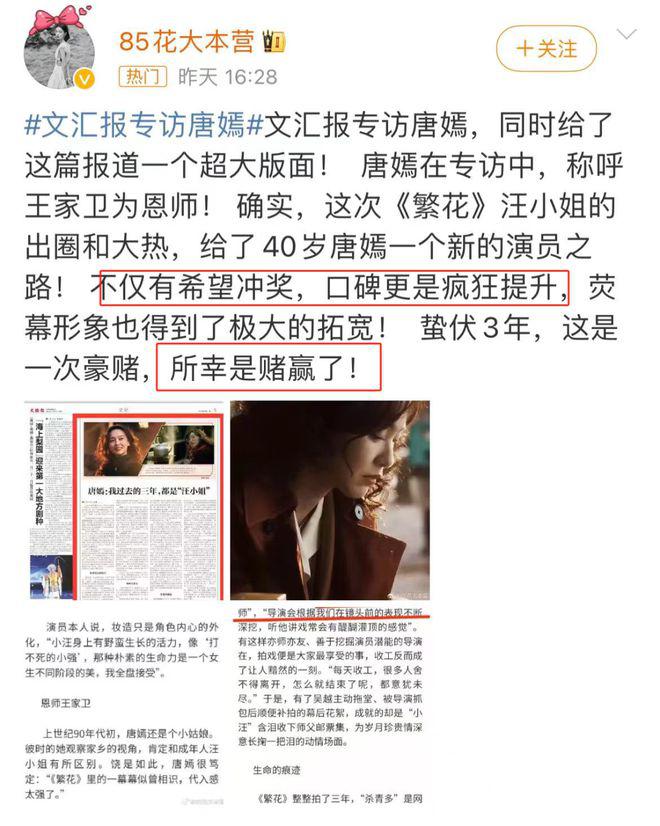 但是《繁花》的成绩有目共睹,腾讯站内热度破 30000,豆瓣评分 8.2,唐嫣饰演的汪明珠频上热搜,演技也得到了广泛认可。这时候风向一下子变了,三年拍一部戏被夸胆大心细押宝成功,甚至有人大胆猜测 85 花第一个拿到视后的该不会是唐嫣吧?
