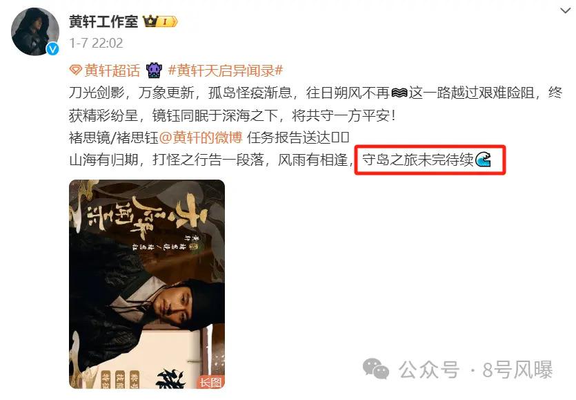 值得一提的是,《天启异闻录》收官当晚,黄轩工作室的文案给出了:" 守岛之旅未完待续 " 的字样。