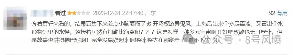 取而代之的是感染疫病的变异岛民和来自天外宇宙的远古邪神,搞得不伦不类,把一众为了中式探案和黄轩来看剧的观众看得一头雾水。