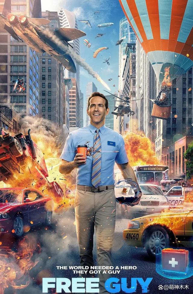 《失控玩家》讲述一位孤独的银行柜员发现自己其实是大型电游的背景人物后,揭露游戏厂商老板的阴谋,拯救所处的游戏世界的故事。海报设计风格充满了美国大片元素,如城市摧毁、汽车燃烧、降落伞英雄等标志性特征。
