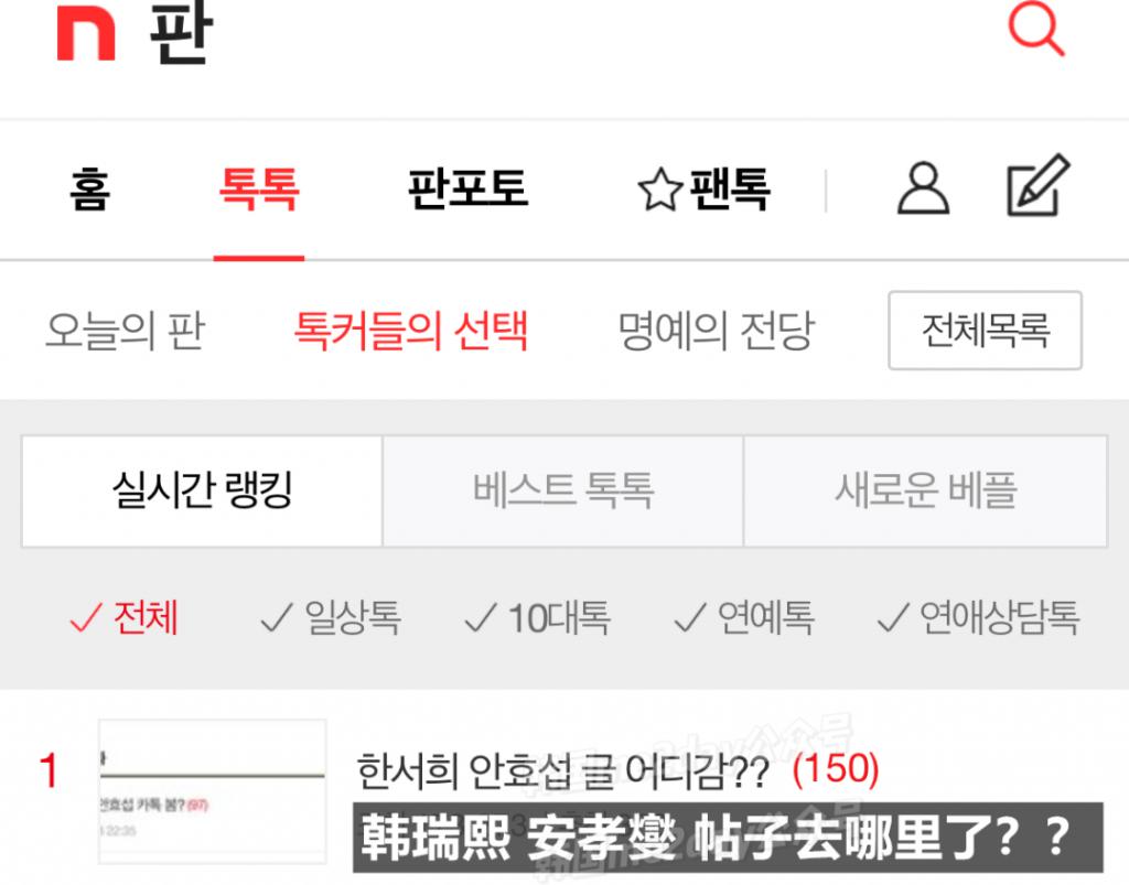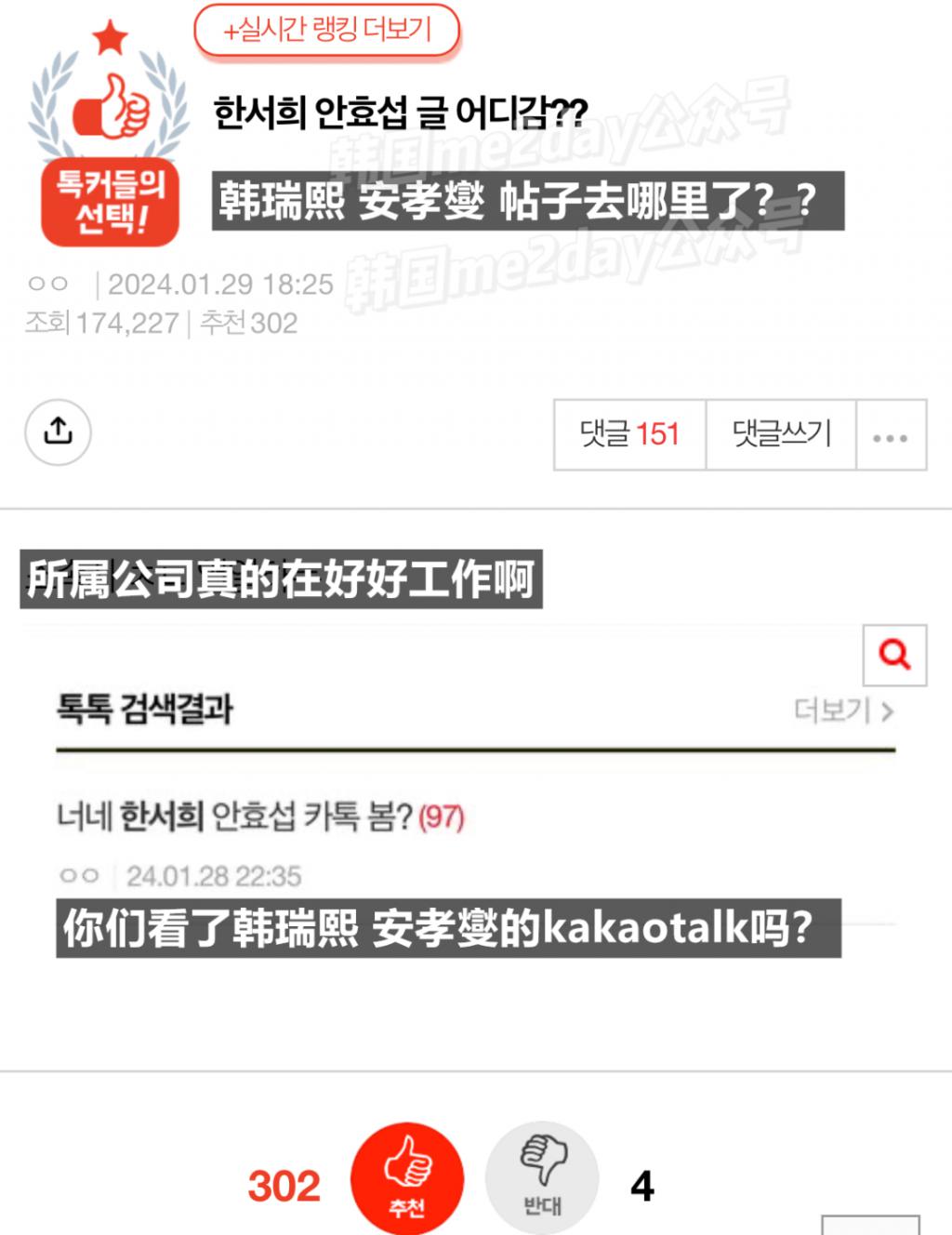 1 月 29 日有网友发表了一则题为《韩瑞熙 安孝燮 帖子去哪里了??》的帖子,登上了 nate pann 热帖排行榜一位。