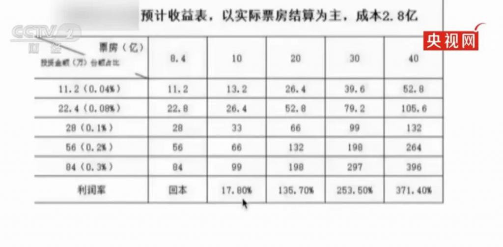 表上显示,票房只要达到 8.4 亿元,投资就能回本,票房如果达到 40 亿,投资率更是可以高达 371.4%。