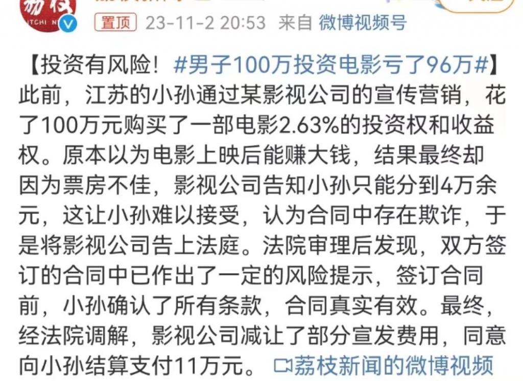2023 年 11 月就有一名男子小孙因为投资电影损失了 96 万元。