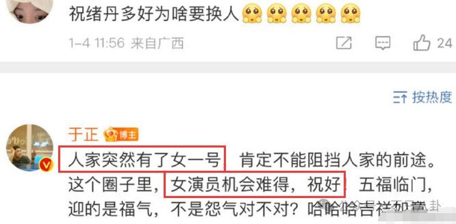 网友问于正为啥换人,于正说祝绪丹突然有了女一号,就不演他的戏了,但他理解女演员机会难得,所以还是祝好。