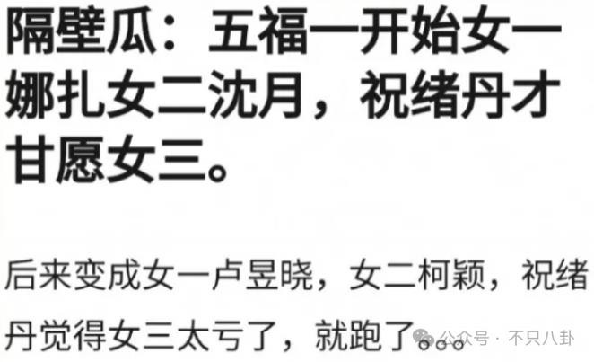 回到《五福临门》换角风波时期,有疑似知情网友透露,祝绪丹不是因为 " 女一 " 才辞演《五福临门》接《镜花缘》的,而是因为不想给卢昱晓做配。