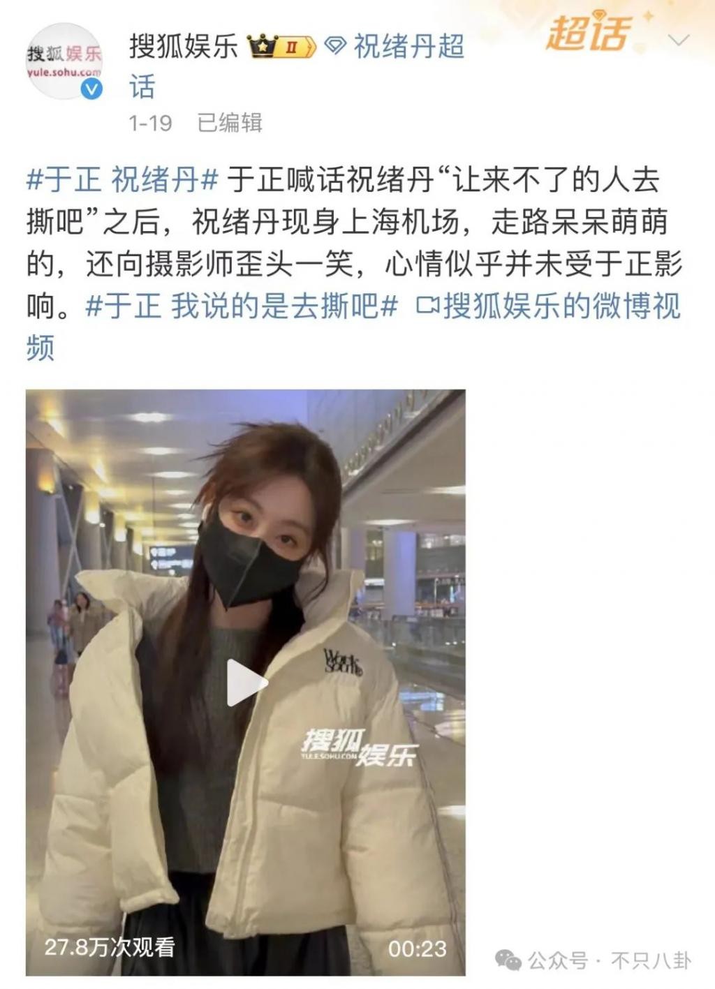 眼看着心心念念的女主戏飞了,有人说全怪于正下场捣乱,让祝绪丹赢了路人缘,却输了 " 业内看重的人品 "。