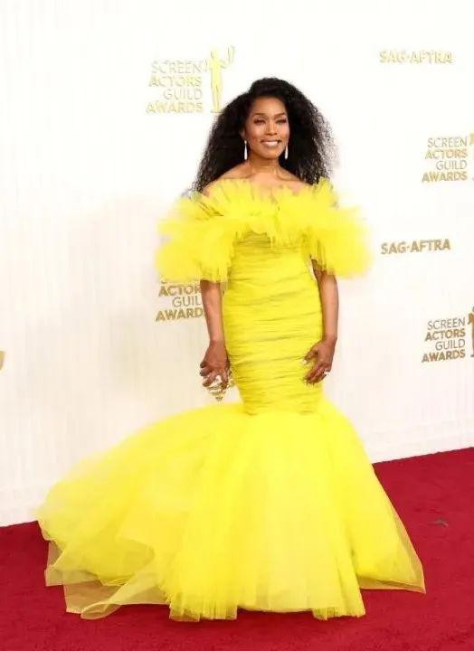 靓丽的颜色穿在黑皮身上也别有一番风采,Angela Bassett 的黄色层叠纱裙明艳有朝气,非常瞩目。