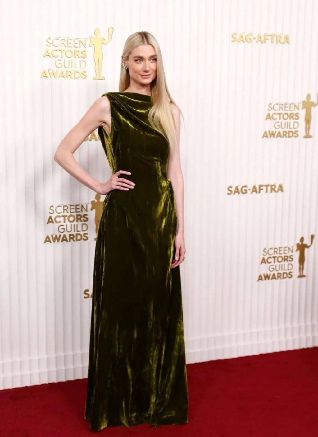 绿色不止一种解题思路,当它和丝绒碰撞在一起就是另一种奢华。如在夜光中闪耀的丝绒礼服极富流动性,Elizabeth Debicki 搭配单边祖母绿耳饰,是恰到好处的克制。