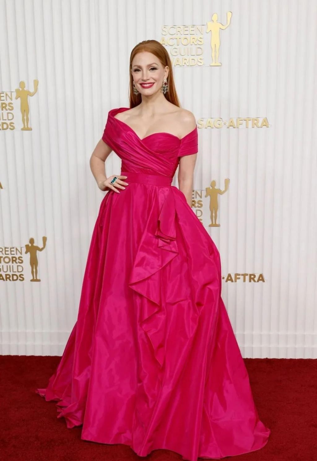 本次红毯上的真人版芭比还得提名 " 劳模姐 "Jessica Chastain,她凭借《乔治和塔米》获得本次限定剧 / 电视电影最佳女演员。