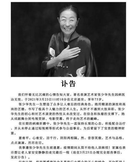 3月25日,知名老戏骨张少华因病去世,享年75岁。众多演艺圈的明星:贾玲、闫学晶、冯远征,还有她的干儿子杨志刚等人纷纷哀悼:张少华先生千古,一路走好!