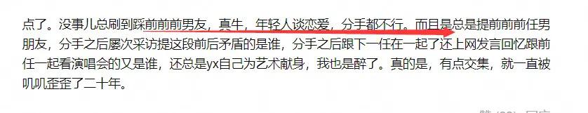 还有人指出,郝蕾非常爱 cue 前男友和前夫,虽然看起来是大女主人设,但其实是爱在网上回忆和前男友恋爱的恋爱脑。