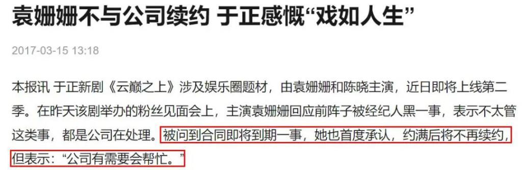 2017 年 3 月,袁姗姗在出席网剧《云巅之上》发布会时宣布,她与于正即将合约到期且不再续约。