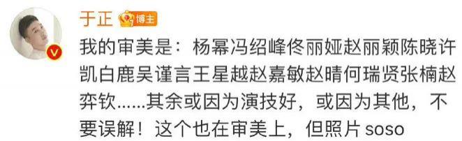 发微博谈自己的审美,提到了杨幂、赵丽颖、佟丽娅等。