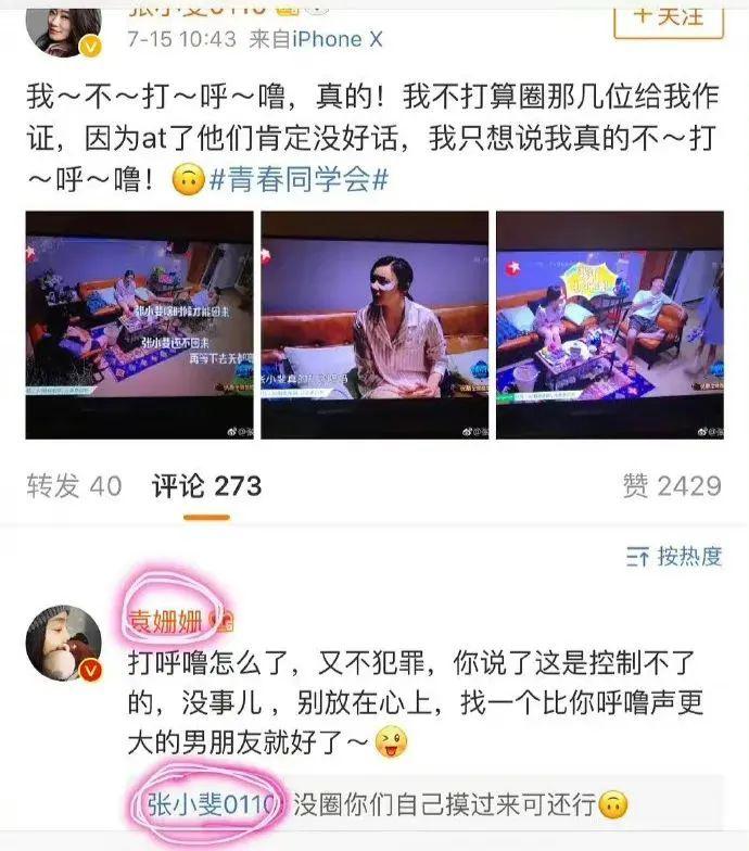 在某档综艺节目里,不顾当事人张小斐的心情,放肆地嘲笑对方睡觉打呼噜。
