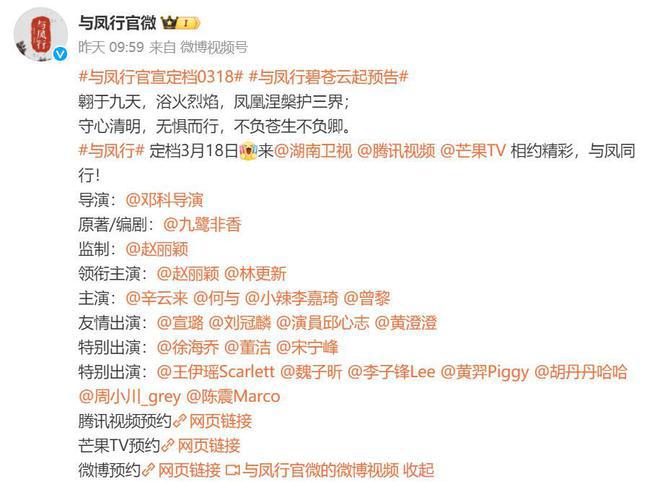 而电视剧《与凤行》也已经定档 3 月 18 日,湖南卫视黄金档播出。