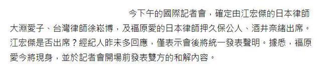 台媒称在 15 号下午的国际记者会上,确定了江宏杰在日本的律师大渊爱子,台北律师徐崧博,还有福原爱方面的日本律师押久保公人,酒井奈绪出席。关于江宏杰是否会现身,经纪人并没有过多的回应,但表示会和律师同一发表声明。