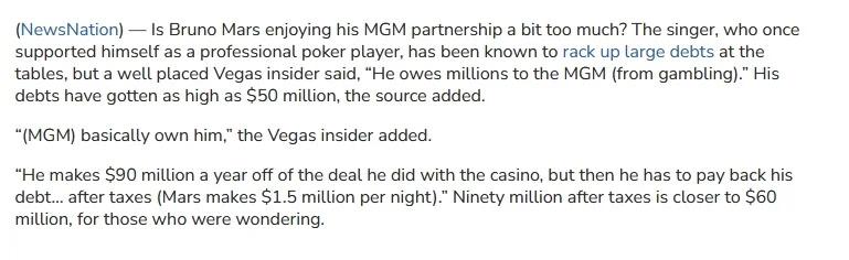 3 月 17 日,据外媒报道," 火星哥 "Bruno Mars 在拉斯维加斯的赌桌上欠下约 5000 万美元(约 3 亿 6 千万人民币)的巨额赌债,知情人士称,火星哥与赌场签订了演出合约,每晚表演的税后收入只有 150 万美元,他将通过表演偿还债务。