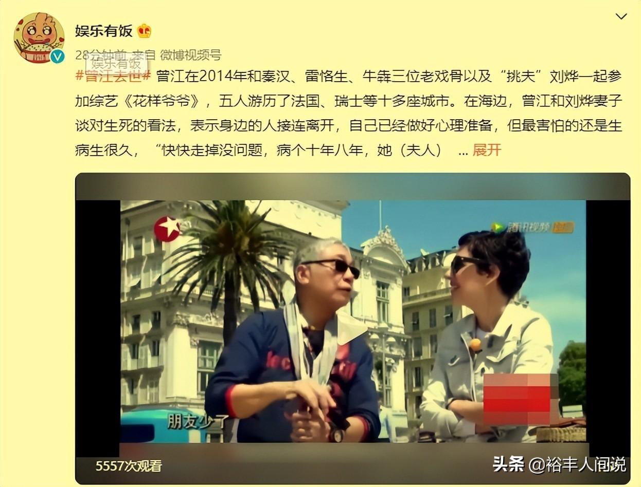 曾江去世之前曾接受媒体采访,被问及到生死的时候,他很坦然,身边的人接连离开,自己已经做好心理准备,但最害怕的是生病很久,快快走掉没有问题,病个十年八年,她怎么办。