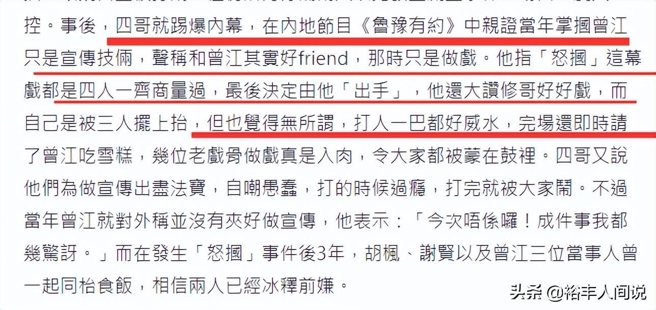 谢贤曾在接受《鲁豫有约》的时候表示,两人当年的事情不过是演戏,掌掴的那一幕是四个人设计好的,最后决定由他出手,毕竟他是个“狠角色(荧幕角色)”。