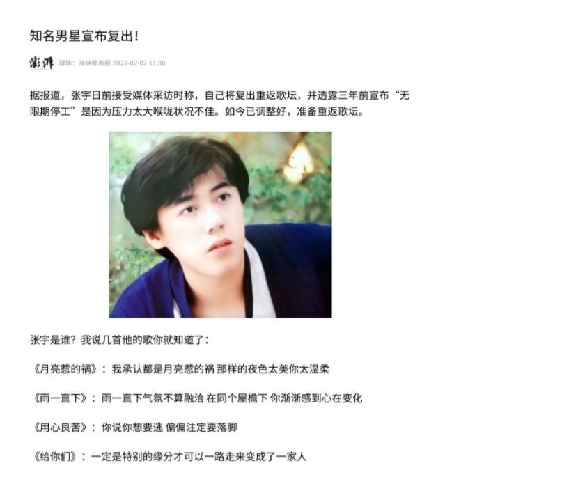 2025年3月2日,张宇高调接受媒体采访,宣布复出,同时准备推出全新单曲。