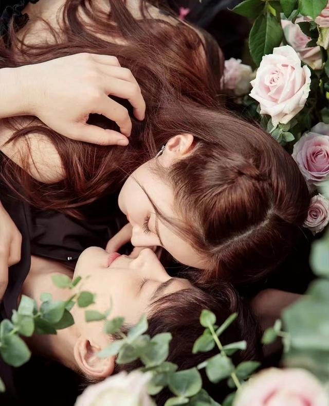 两人闭上眼睛依偎在一起,躺在粉色的月季花丛中,画面美得像一幅油画一般,看得出来他们如今非常幸福。