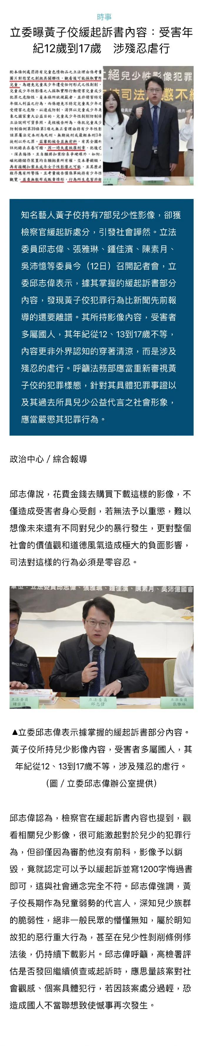 据台媒,黄子佼缓起诉书内容曝光,7 部非法影像受害者从 12、13 岁到 17 岁不等,内容涉及残忍虐行,部分内容显示:黄子佼犯罪行为比新闻先前报导的还要离谱。其所持影像内容,受害者多属台湾人,其年龄从 12、13 到 17 岁不等,内容更非外界认知的穿着清凉,而是涉及残忍的虐行。