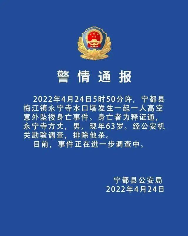 4月24日,赣州市宁都县公安局通报称,2022年4月24日5时50分许,宁都县梅江镇永宁寺水口塔发生一起一人高空意外坠楼身亡事件。身亡者为释证通,永宁寺方丈,男,现年63岁。经公安机关勘验调查,排除他杀。